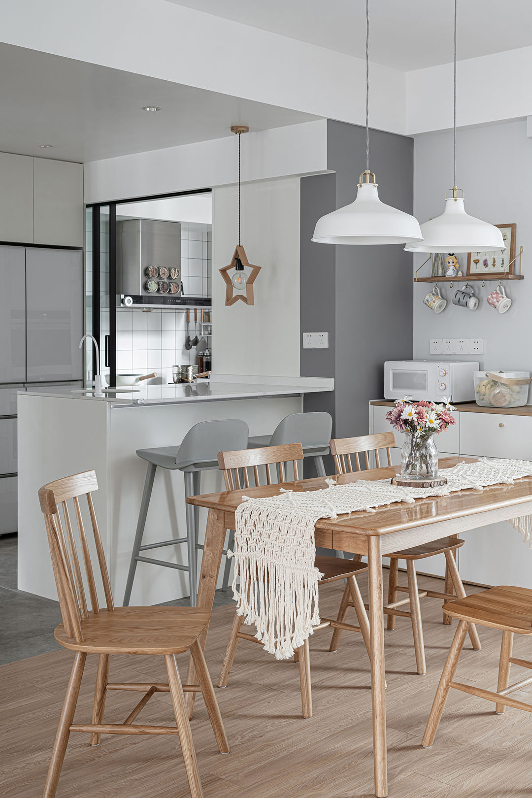 餐厅同样选择的原木风餐桌椅,搭配两个白色小吊灯,旁边设餐边柜摆放家居用品。后面是西厨岛台,也可以当吧台使用,非常实用,也可以提升空间格调感。